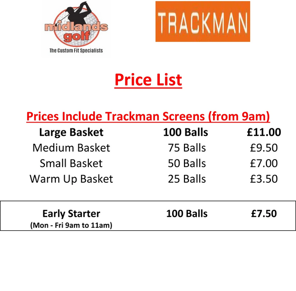 All ball pricing includes the use of the new Trackman MEGA screens. Almost twice the size of Toptracer range screens, and larger than normal Trackman screens